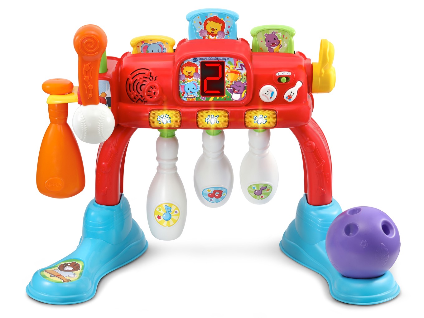 This electronic sports center infant toy features an exciting 2-in-1 baseball and bowling play experience with an animated scoreboard.